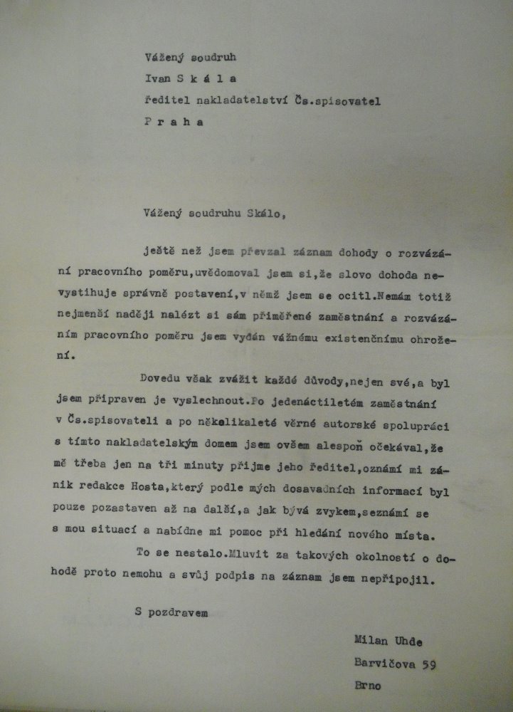 Dopis Milana Uhdeho Nakladatelství Československý spisova...