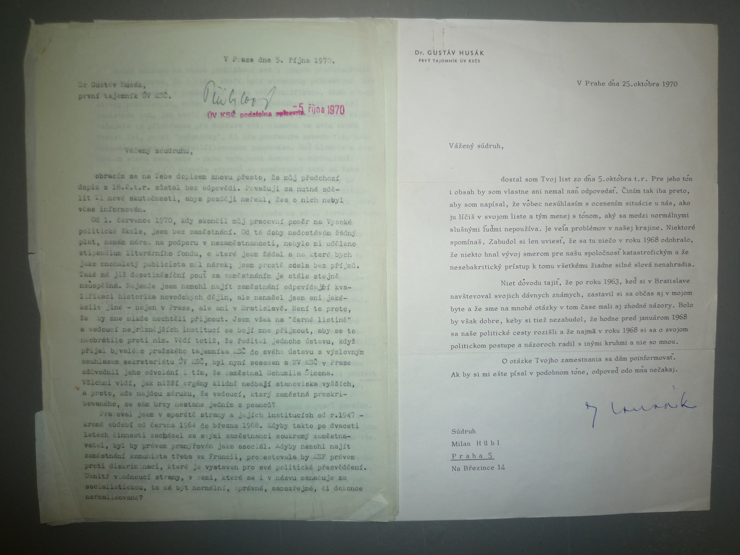Letter from Milan Hübl to Gustáv Husák, 5 October 1970